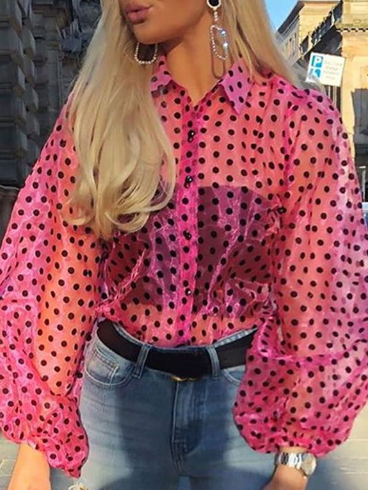 Polka Dot Transparent Turn-Down Collar Long Sleeve Women Blouses