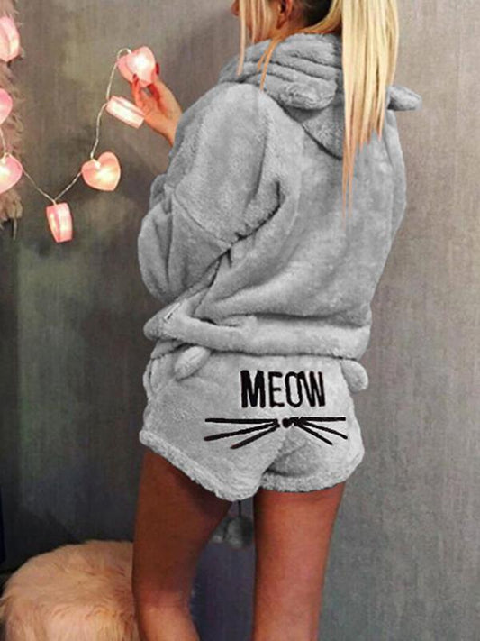 Seindeal Cats Print Cat Ears Pockets Animal Pajamas 2 Piece Cute Nightgown Hooded Ladies Plus Size