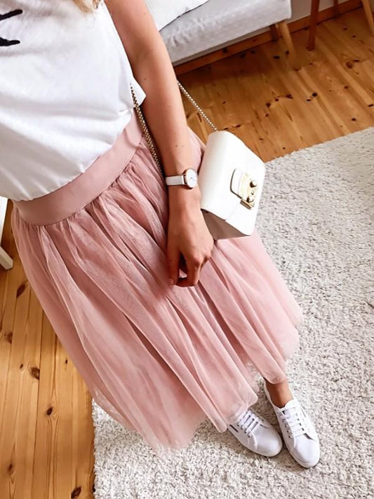Floral Mesh Pleated High Waist Women Skirts Tulle Skirt Midi Skirt