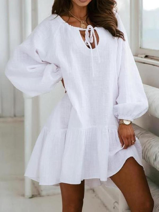 Solid Color Ruffles Drawstring Round Neck Long Sleeve Lantern Sleeve A-Line Mini Dress Women Fashion Summer Dress