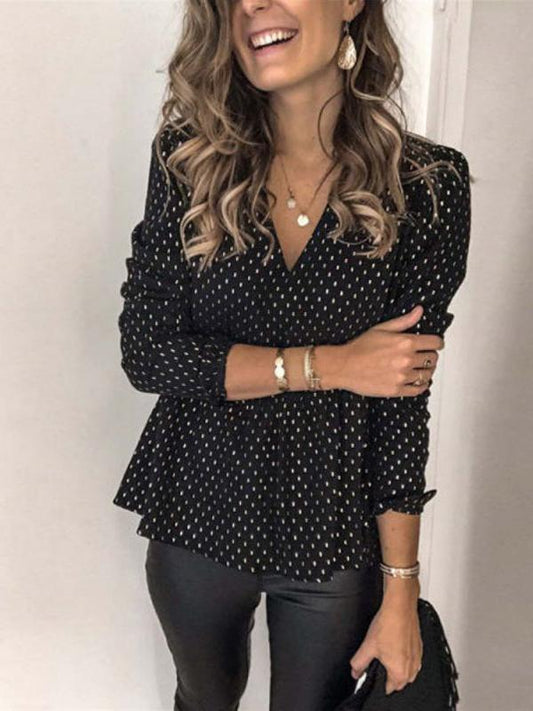 Polka Dot Ruffles Deep V-Neck Long Sleeve Short Women's Fashion Blouses