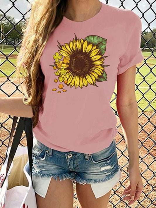 Floral Print Round Neck Short Sleeve Casual Women Tops T-Shirt Tops