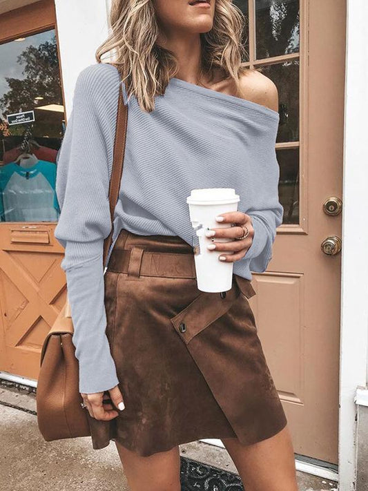 One Shoulder Off Shoulder Long Sleeve Oversize Casual Knit Sweater Women T-Shirt