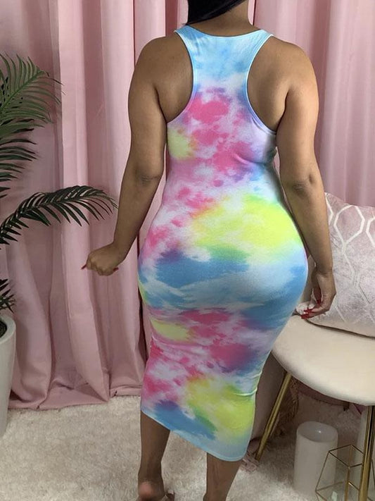 Tie Dye Fitted U-neck Sleeveless Maternity Casual Midi Dress