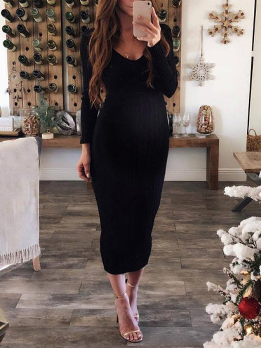 Bodycon V-neck Backless Long Sleeve Maternity Sweater Midi Dress