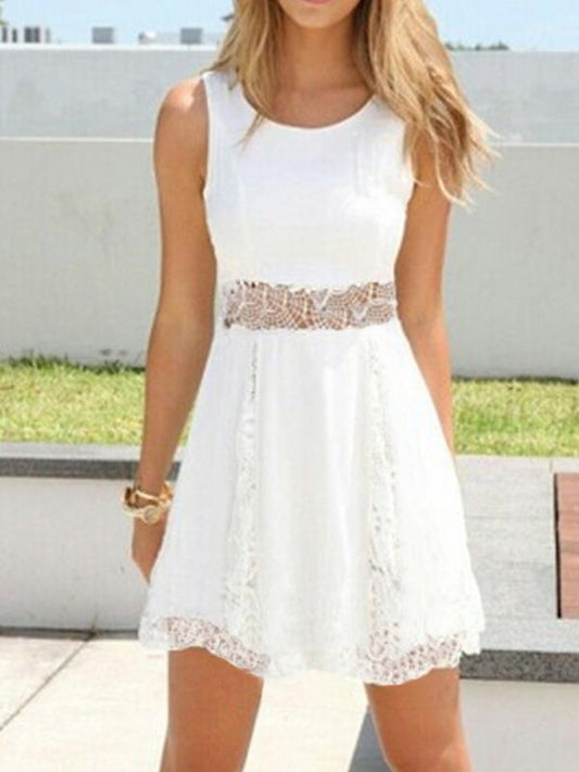 White Cut Out Lace Round Neck Sleeveless Women Mini Dresses Lace Dress Evening Dress