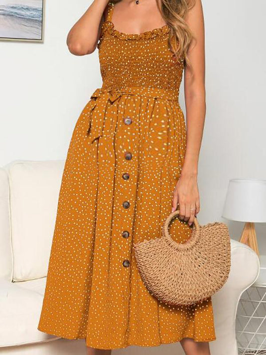 Polka Dot Print Belt Buttons Maternity For Babyshower Beach Adjust Waist Cute Midi Dress