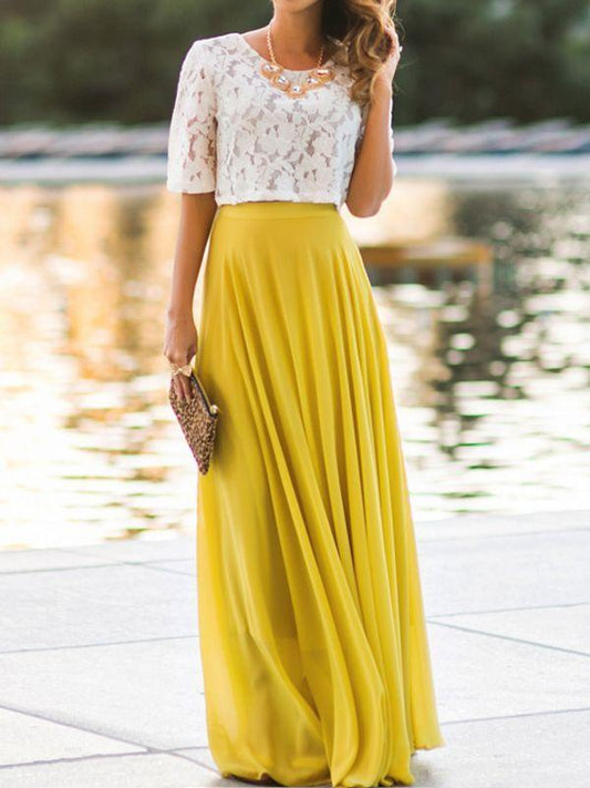 Yellow Draped Elastic Waist Elegant Summer Bohemian Chiffon Maxi Skirt Women