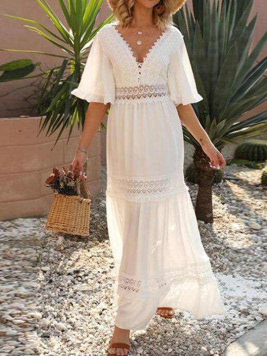 Patchwork Lace Deep V-neck Half Sleeve Bohemian Maternity Dress