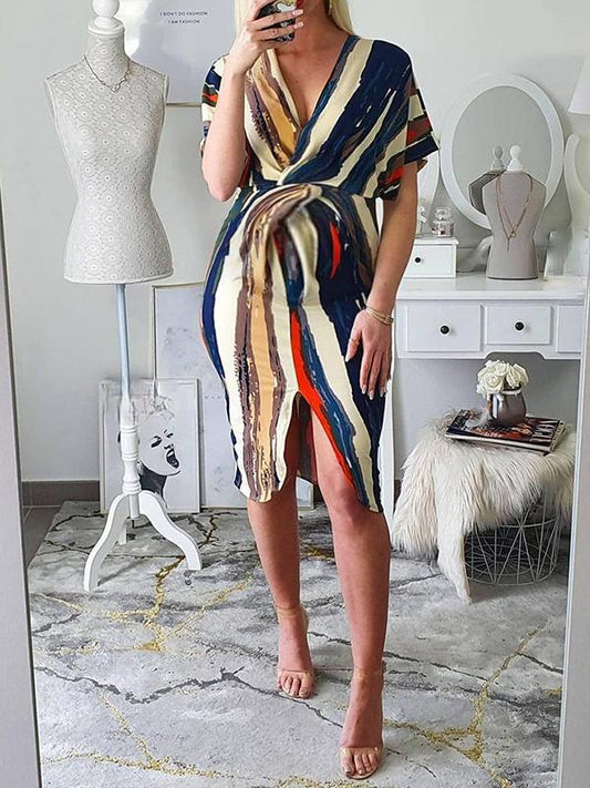 Bodycon Striped Print Vneck Short Sleeve Side Slit Maternity Midi Dress