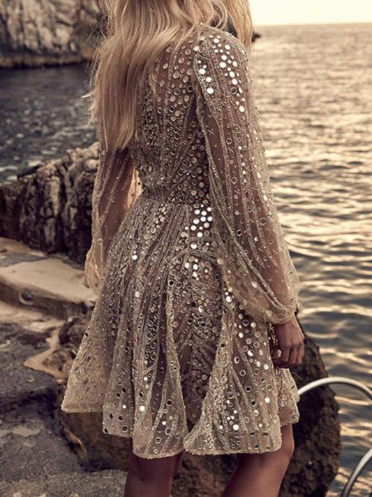 Golden glitter deep v-neck long sleeve a-line mini dresses women sequin dress