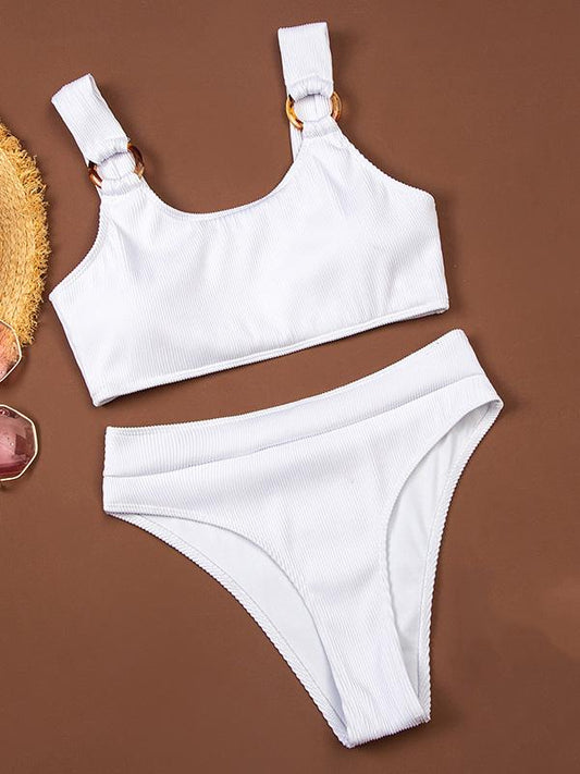 Solid Color Metal Buckle Round Neck Sleeveless Short High Waist Bikini Women Fashion Swimwear