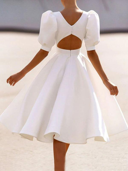 Cut Out Backless Round Neck Short Sleeve Lantern Sleeve A-Line Midi Dress Women Fashion Elegant Dress