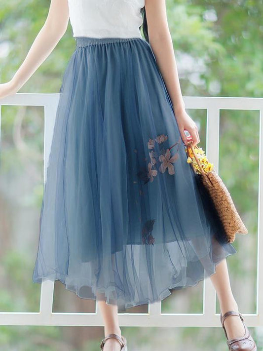 Floral Mesh Pleated High Waist Women Skirts Tulle Skirt Midi Skirt