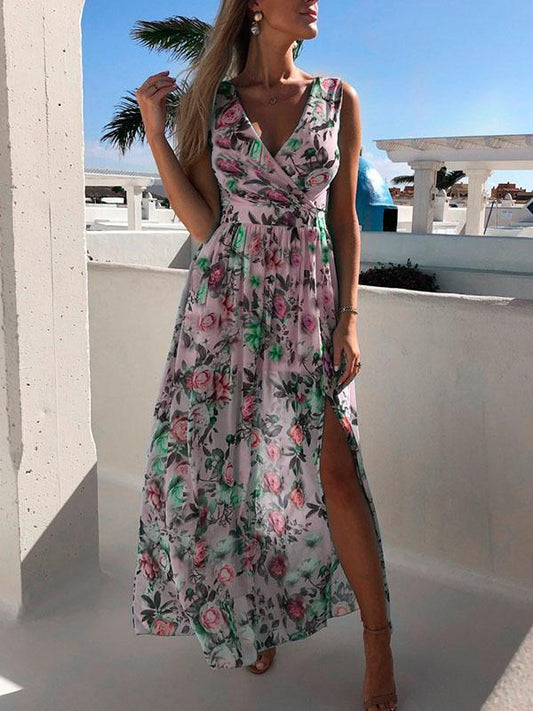 Flowers Floral V-Neck Sleeveless Side Slit Maxi Dress Beach Dress Summer Dress