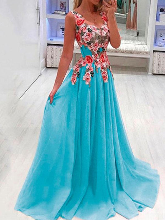 Floral Print Lacing Deep V-Neck Spaghetti Straps A-Line Maxi Dress Women's Fashion Wedding Dress