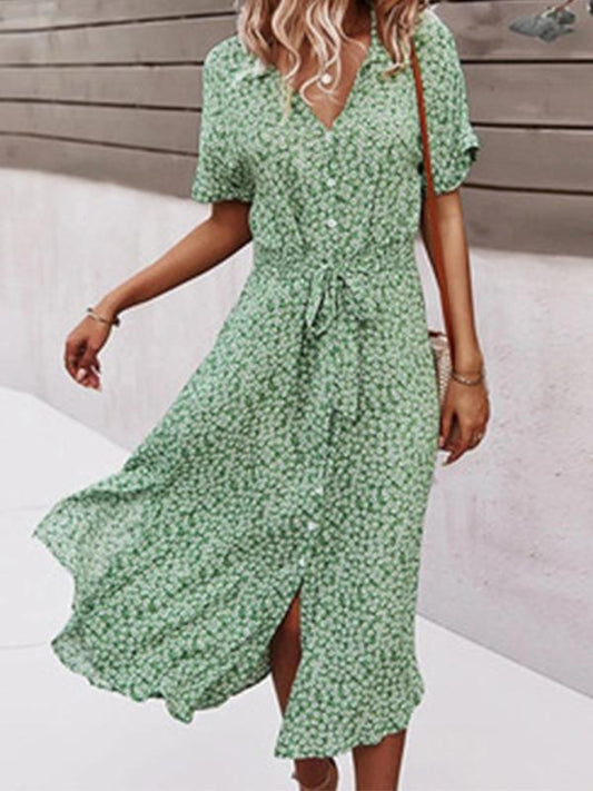 Floral Print Buttons Belt V-Neck Short Sleeve Midi Dresses Women's Summer Dress