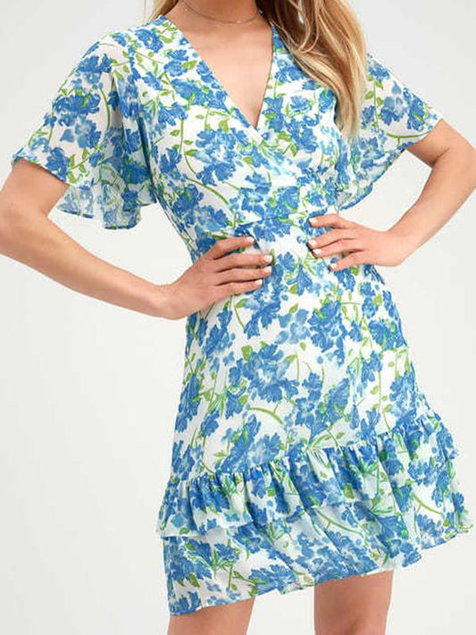 Floral Print Ruffle V Neck Short Sleeve Mini Dresses Women'S Fashion Beach Dress Summer Dress