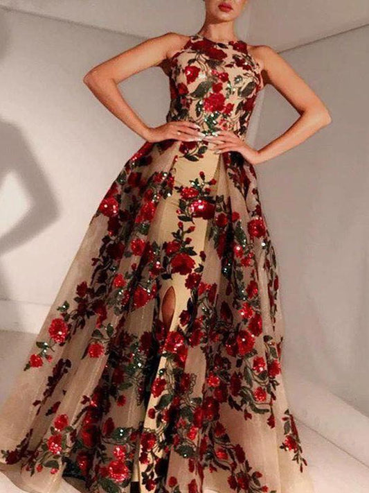 Floral Print Sequins High Waist Slit Round Neck Sleeveless A-Line Maxi Dresses Women Fashion Evening Dress