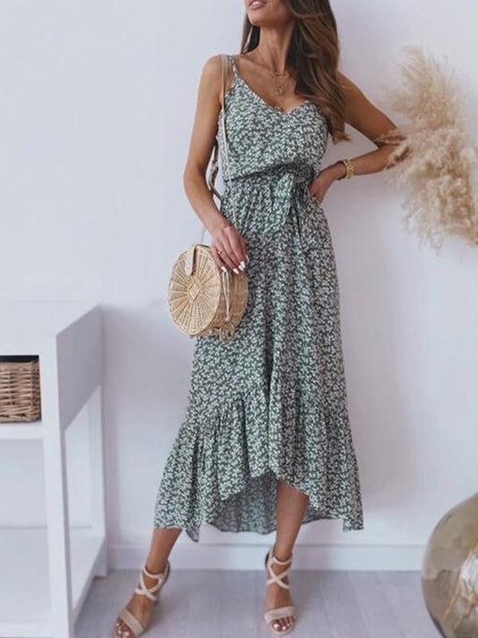 Floral Print Belt Backless V-Neck Spaghetti Straps A-Line Midi Dress Women's Fashion Summer Dress