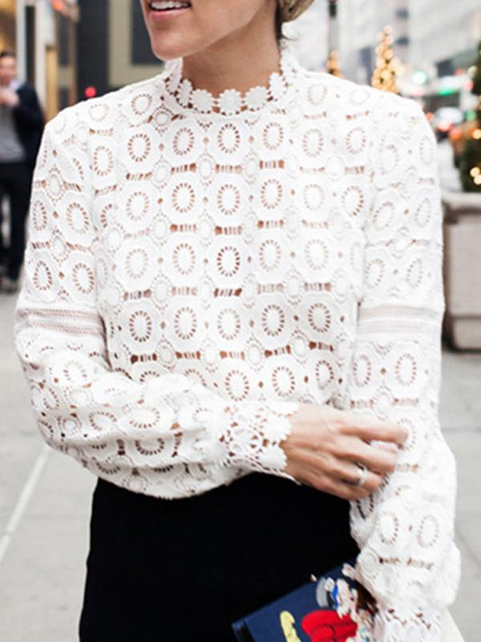 White Lace Flowers Ribbon Collar Lantern Sleeve Long Sleeve Elegant Blouse Women Tops Tops