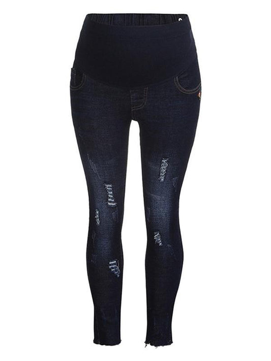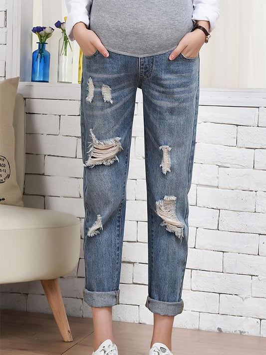 Momnfangcy Pockets Buttons Ripped Destroyed Casual Maternity Long Jeans
