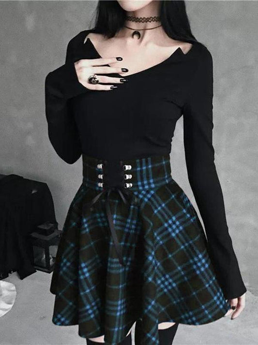 Checkered Lacing High Waisted A-Line Mini Skirt Skater Skirt Pleated Skirt Women Fashion