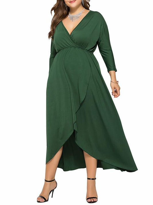 Seindeal Solid Slit V-neck Long Sleeve High-low Plus Size Midi Dress