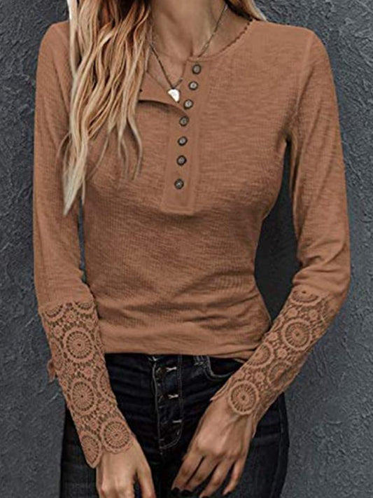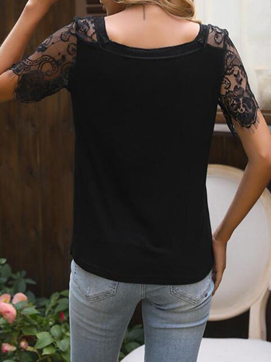 Patchwork Lace V-Neck Short Sleeve T-Shirt Regular Women Fashion Top