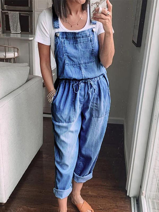 Solid color pockets drawstring women overalls dungarees