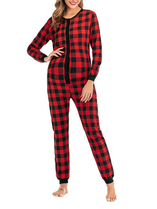 Plaid Christmas Button Pockets Long Pajama Long Sleeve Maternity Jumpsuit