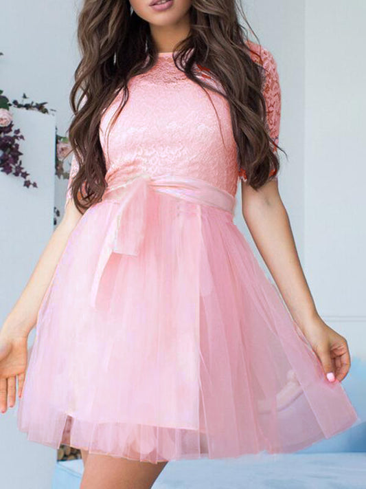 Seindeal Ball Gown Party DressSolid Color Belt Mesh Lace Round Neck Half-Length Women Mini Dresses Elegant Dress Party Dress Tulle Dress