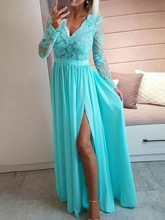 Lace Slit V Neck Long Sleeve Women Maxi Dresses Elegant Dress Lace Dress Evening Dress