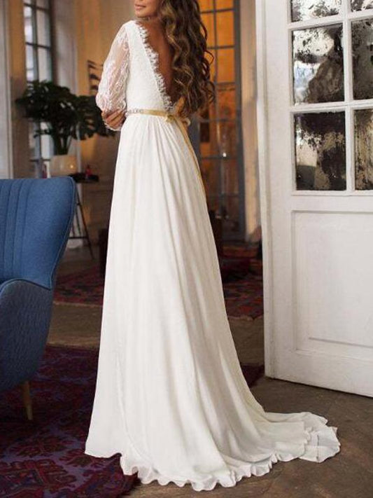 White Lace Deep V Backless Round Neck Long Sleeve Elegant Maxi Dress Evening Dress Ball Gown