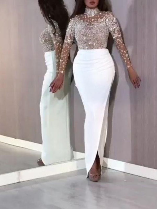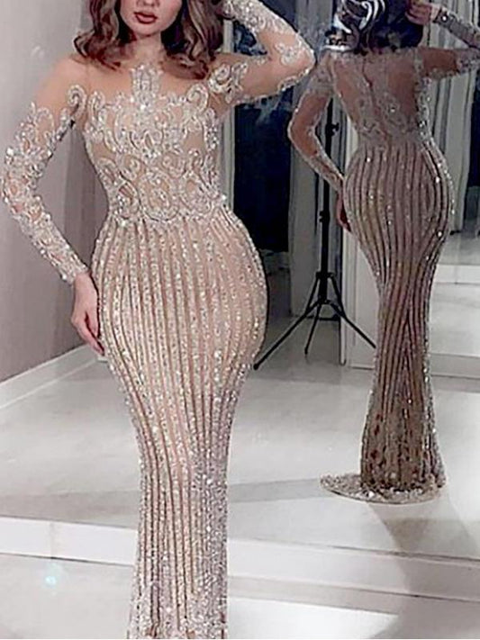 Glitter Fishtail Round Neck Long Sleeve Women Maxi Dresses Tight Dress Evening Dress Ball Gown