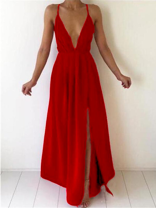 Side Slit Backless Deep V-Neck Spaghetti Straps Women Maxi Dresses Party Dress Ball Gown