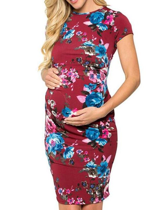 Floral Print Maternity For Babyshower Round Neck Short Sleeve Honey Girl Mini Dress