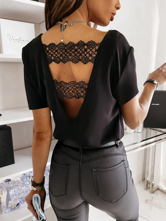 Solid Color Lace V Neck Short Sleeve Top Women Fashion T-Shirt