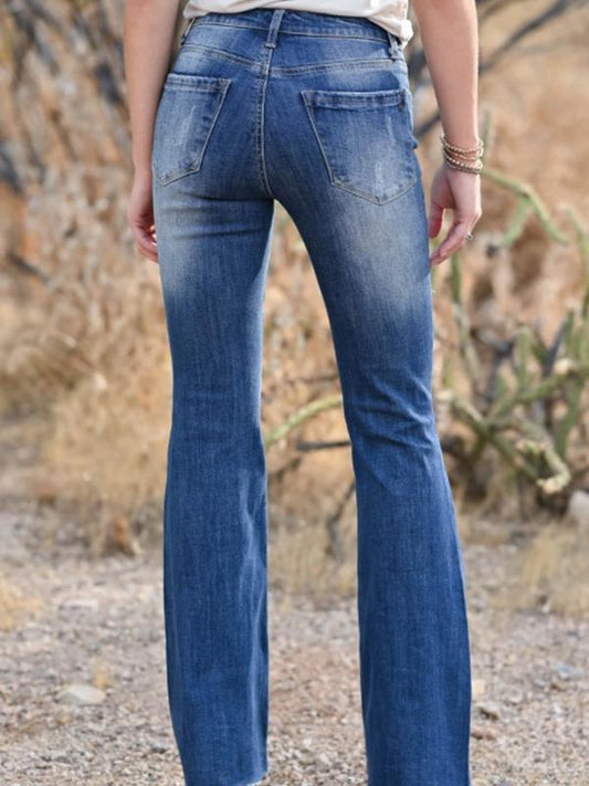 Solid Color Zipper Destroyed Pockets Long Flare Pants High Waist Flare Women Fashion Jeans