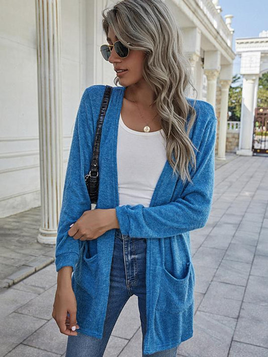 Solid Color Pockets Long Sleeve Long Ladies Fashion Cardigan