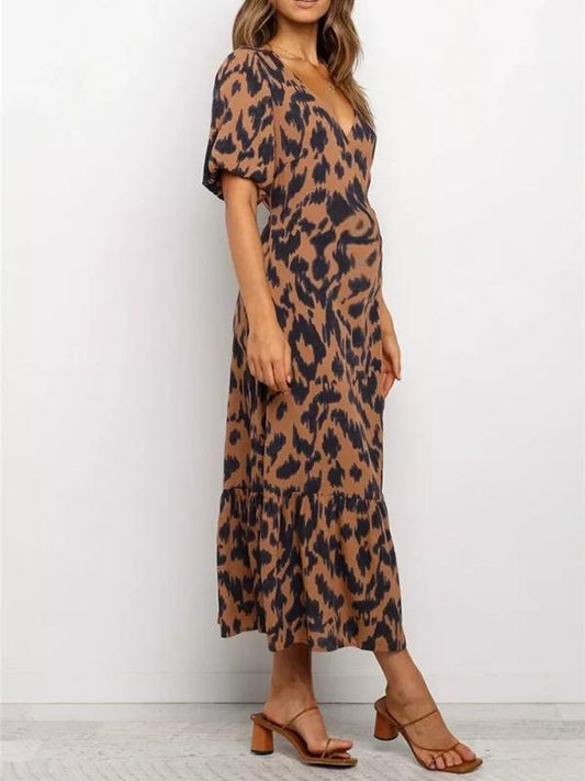 Leopard Slit Flowy Below Knee V-neck Short Sleeve Party Materniaty Midi Dress