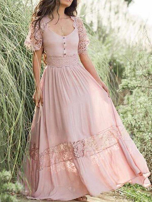 Patchwork Lace Hollow-out V-Neck Short Sleeve A-Line Maxi Dress Women Fashion Casual Dress