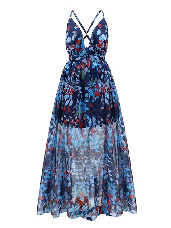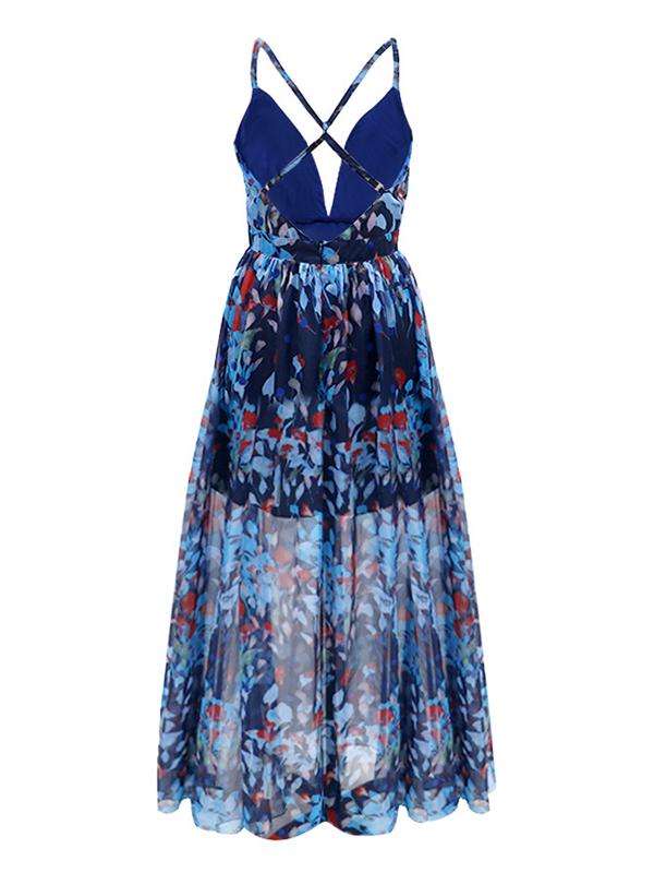 Flowers Backless Cross Back Suspender Skirt Floor Length Plunging Neckline Royal Blue Maternity Dress