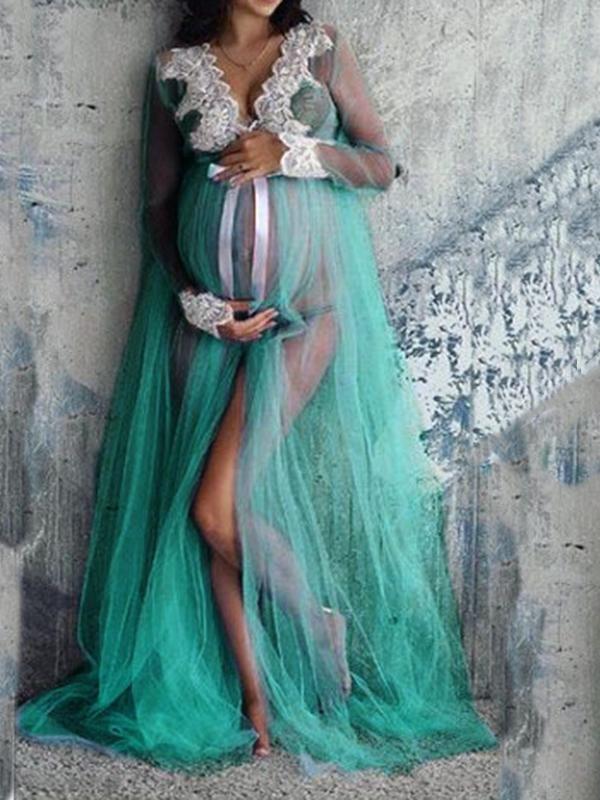 Patchwork Lace Grenadine Ribbons Slit Maternity For Babyshower Maxi Dress