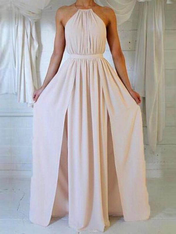 Solid Color Cut Out Slit Round Neck Sleeveless A-Line Maxi Dress Women Mod Elegant Dress